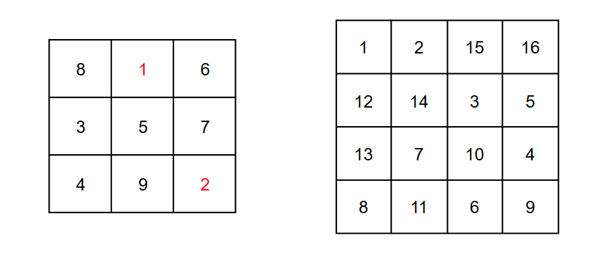 一个n阶幻方,是一个n行n列网格,由数字1~n^2组成,它的每行、每列、每左斜对角线网格、每斜对角线网格上的数字之和均相等