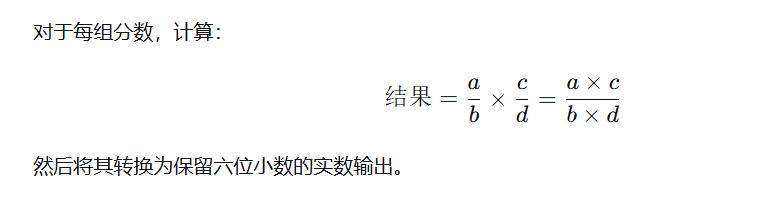 给定 n 组分数,每组包含两个分数。请你计算每组中两个分数的乘积,并以实型小数形式输出结果,保留六位小数。
