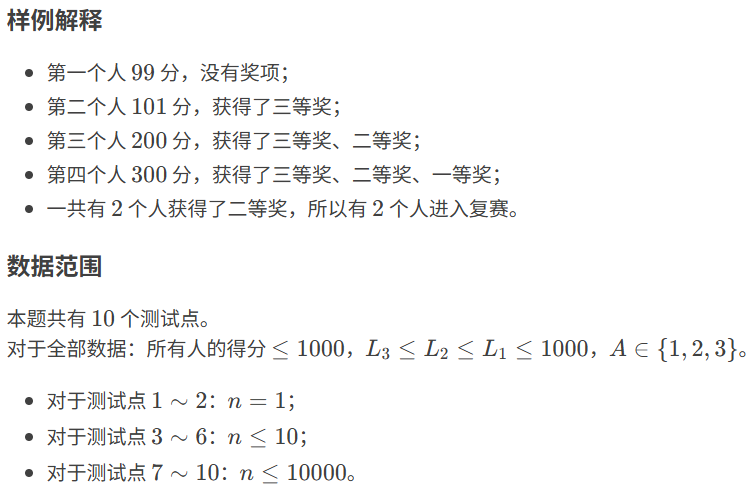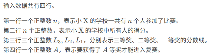 小 X 参加了一场作文比赛的初赛。算上小 X ,他的学校一共有 n 个人参加了这场比赛。一个礼拜后,小 X 兴奋地打开比赛官网,发现一等奖、二等奖、三等奖的分数线和所有人的得分都已经公布了,但没有提到获得什么奖项才能进入复赛。小 X 想问问你,如果要获得了 A 等奖才能进入复赛的话,他的学校有多少人能进入复赛呢?