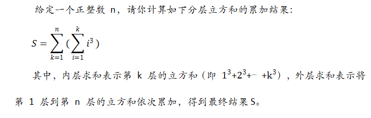 输出仅一行,包含一个整数,表示分层立方和的累加结果 S。