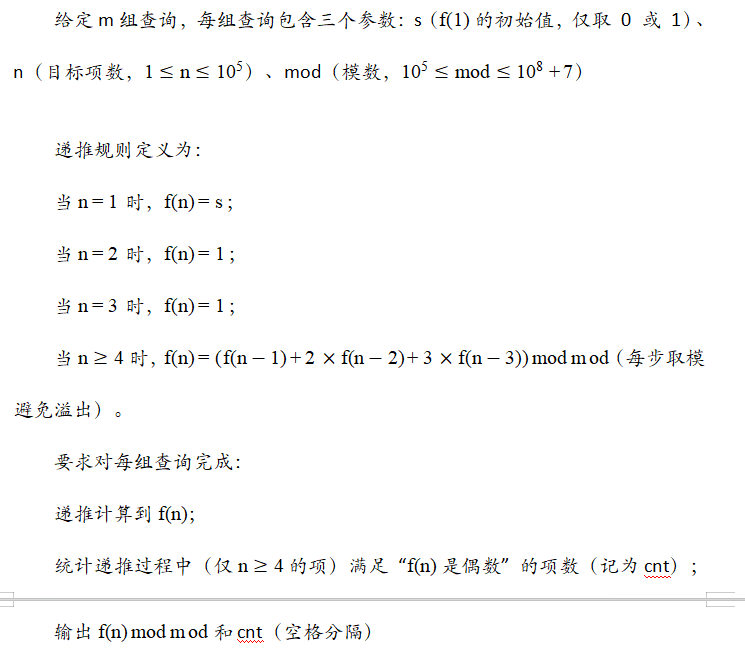 第一行输入正整数 m(1≤m≤20) 接下来 m 行,每行输入三个参数:s(0 或 1)、n(目标项数)、mod(模数)