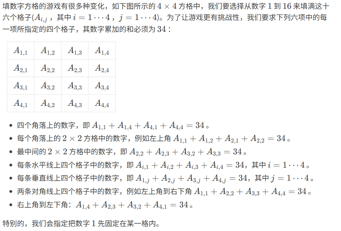 输入只有一行包含两个正数据 i 和 j ,表示第 i 行和第 j 列的格子放数字 1。剩下的十五个格子,请按照前述六项条件用数字 2 到 16 来填满。
