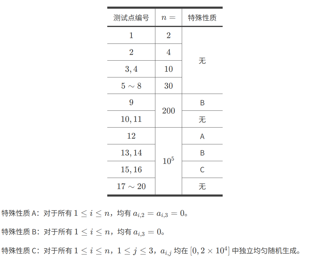 - 对于所有 1 \leq i \leq n,1 \leq j \leq 3,均有 0 \leq a_i,j \leq 2 \times 10^4。