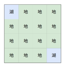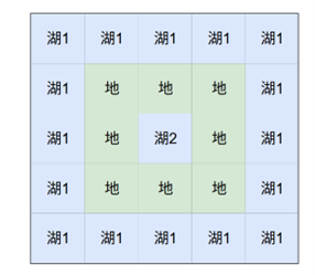 只要挖掉湖2那个网格上、下、左、右相邻的其中任意一个网格就可以把两个湖连通,此时地面网格数为7。