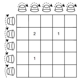 谜题是有一个n行m列的矩阵,每个格子都有一个数字,数字的数值在谜题的一开始都是0,在矩阵的每行每列都对应有一个可以旋转的按钮,左旋一次这个按钮就可以使得对应行或列矩阵内的所有数字减1,右旋一次则可以使得对应行或列的矩阵内的所有数字加1。