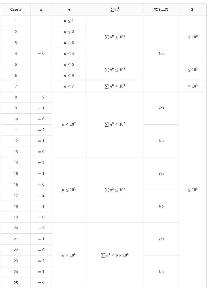 每个测试点的详细数据范围见下表。如果表中 “完全二叉” 为 Yes,则该输入文件的每个数据满足:网线信息的第 j 行 (1 \leq j < n) 输入的两个数依次是 \left\lfloor \frac {j + 1} {2} \right\rfloor 和 j + 1。